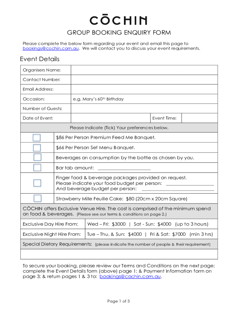 GROUP BOOKING Inquiry FORM Please complete the below form regarding your event and email this page to bookings@cochin.com.au. We will contact you to discuss your event requirements. Event Details