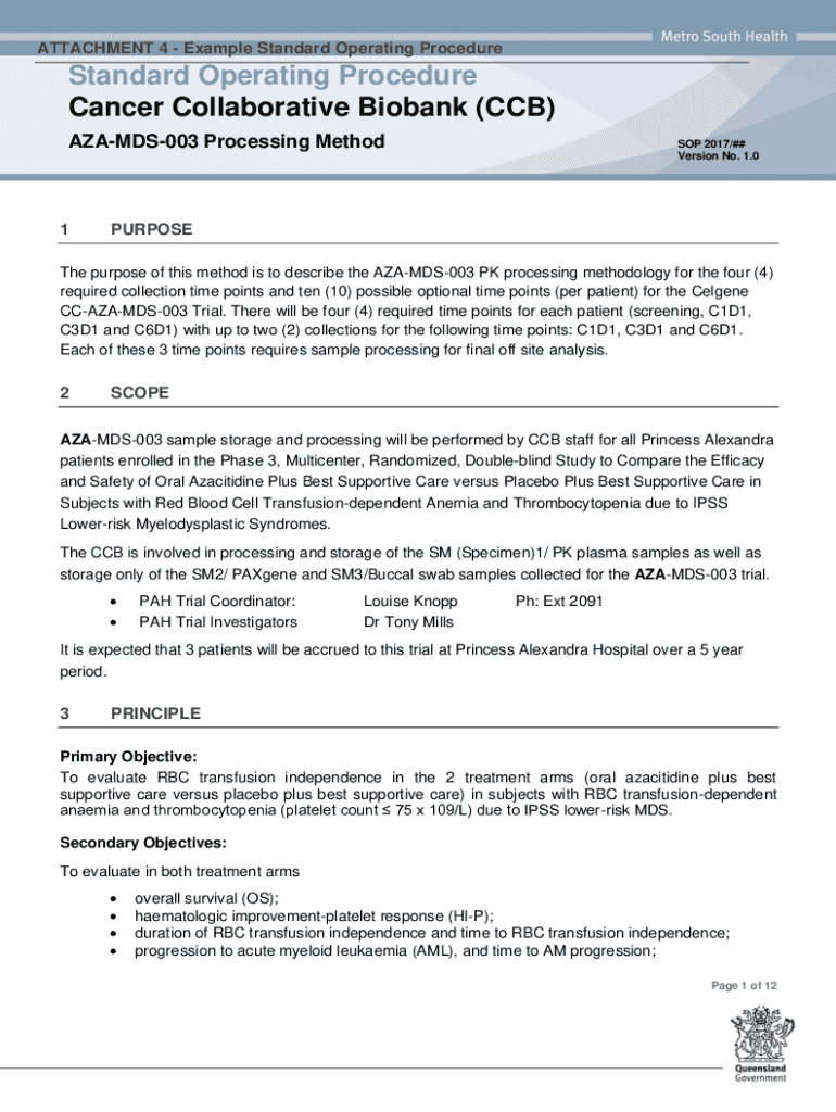 ATTACHMENT 4 Example Standard Operating ProcedureStandard Operating Procedure Cancer Collaborative Biobank (CCB) AZAMDS003 Processing Method1SOP 2017/## Version No. 1.0PURPOSEThe purpose of this method