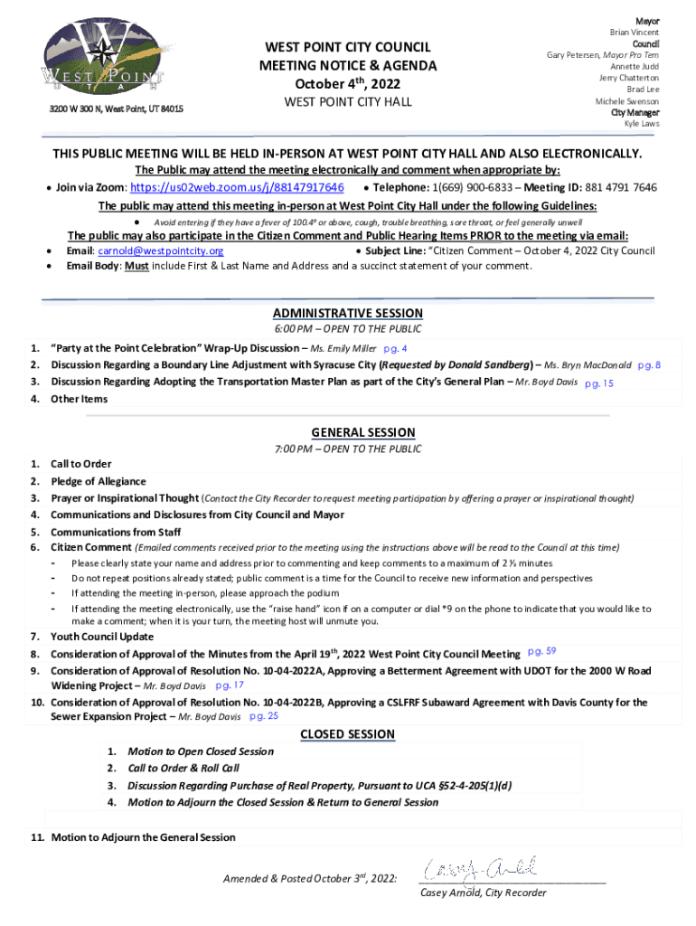 WEST POINT CITY COUNCIL MEETING NOTICE & AGENDA October 4th, 2022 WEST POINT CITY HALL3200 W 300 N, West Point, UT 84015Mayor Brian Vincent Council Gary Petersen, Mayor Pro Tem Annette Judd Jerry
