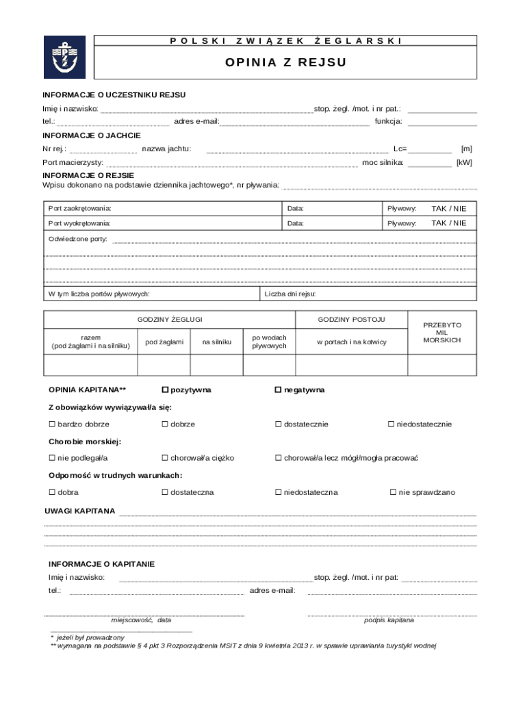Instructions for the form Opinia z rejsu - Polski Zwizek eglarski - pya org