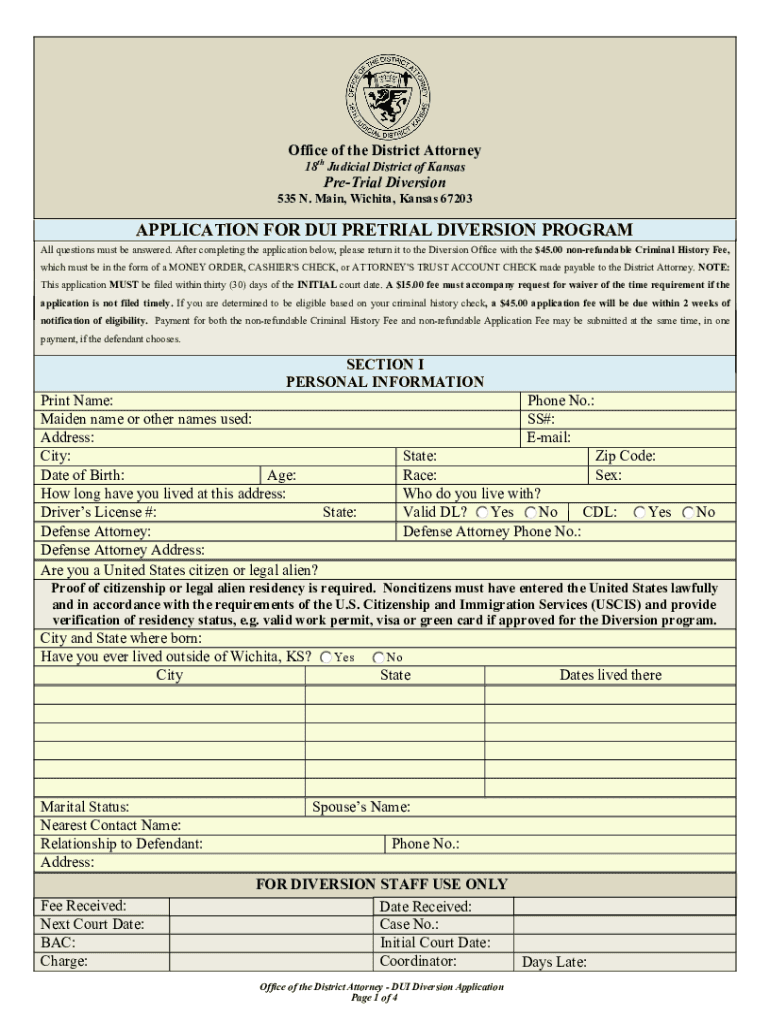 Office of the District Attorney 18th Judicial District of KansasPreTrial Diversion535 N. Main, Wichita, Kansas 67203APPLICATION FOR DUI PRETRIAL DIVERSION Program questions must be answered. After