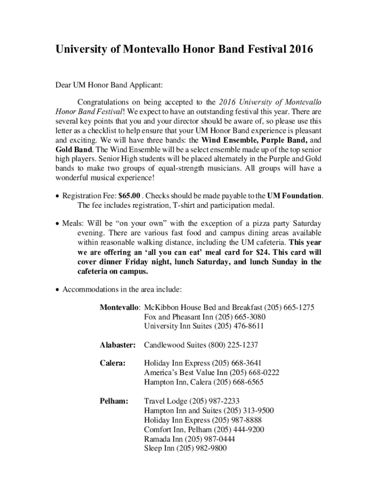 University of Montebello Honor Band Festival 2016 Dear UM Honor Band Applicant: Congratulations on being accepted to the 2016 University of Montebello Honor Band Festival! We expect to have an outstanding