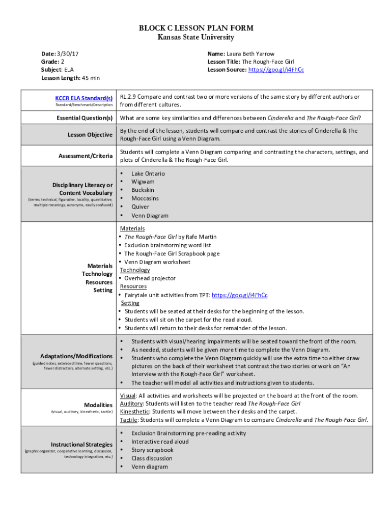 Get the free BLOCK C LESSON PLAN FORM Kansas State University