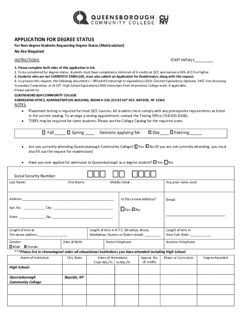 APPLICATION FOR DEGREE Status Nondegree Students Requesting Degree Status (Matriculation)No Fee Required STAFF INITIALS___INSTRUCTIONS:1. Please complete both sides of this application in ink. 2.