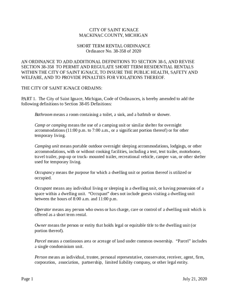 CITY OF SAINT GRACE MACKINAC COUNTY, MICHIGAN SHORT TERM RENTAL ORDINANCE No. 38358 of 2020 AN ORDINANCE TO ADD ADDITIONAL DEFINITIONS TO SECTION 385, AND REVISE SECTION 38358 TO PERMIT AND REGULATE