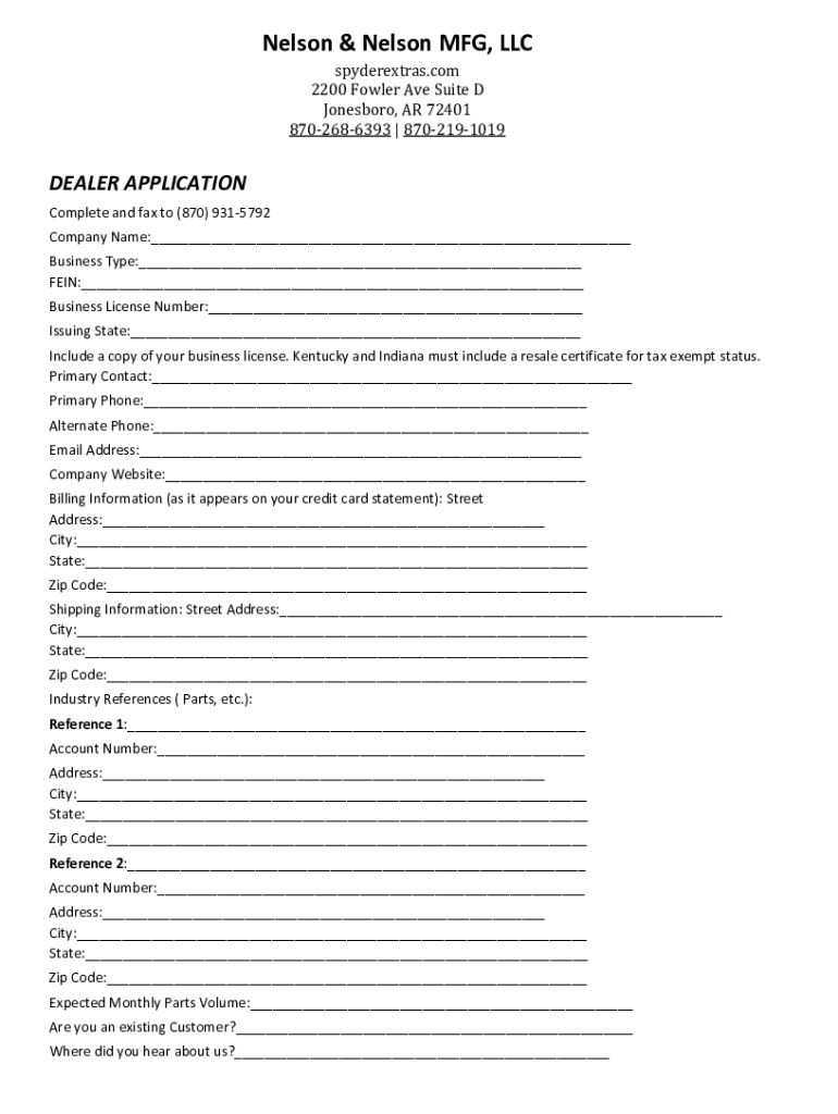 Nelson & Nelson MFG, LLC spyderextras.com 2200 Fowler Ave Suite D Jonesboro, AR 72401 8702686393 | 8702191019DEALER APPLICATION Complete and fax to (870) 9315792 Company Name:___ Business Type:___