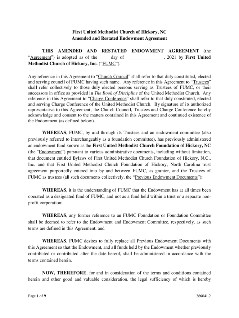 First United Methodist Church of Hickory, NC Amended and Restated Endowment Agreement THIS AMENDED AND RESTATED ENDOWMENT AGREEMENT (the Agreement) is adopted as of the ___ day of ___, 2021 by First