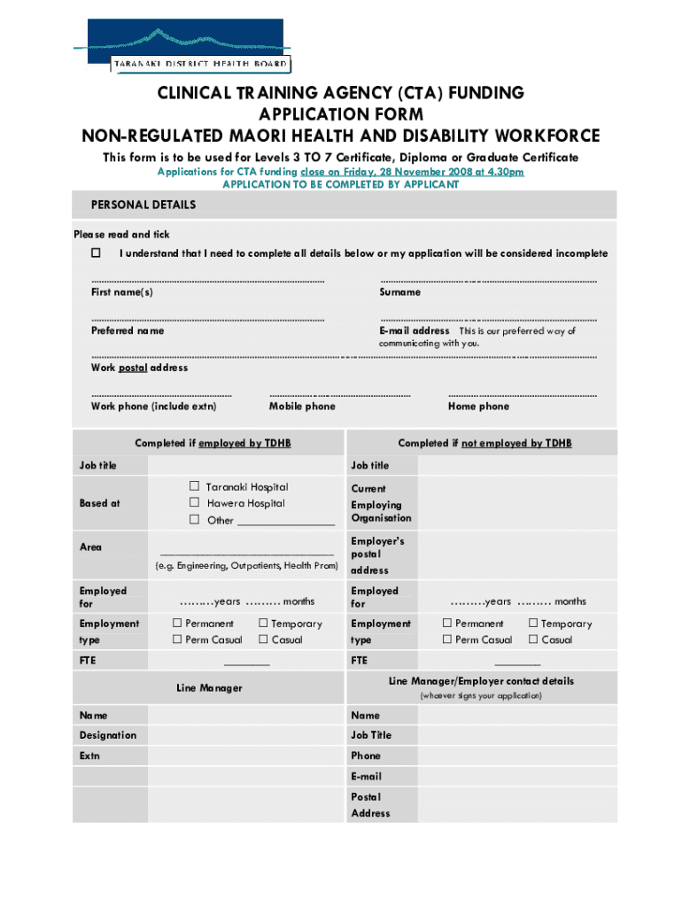 CLINICAL TRAINING AGENCY (CTA) FUNDING APPLICATION FORM UNREGULATED MAORI HEALTH AND DISABILITY WORKFORCE This form is to be used for Levels 3 TO 7 Certificate, Diploma or Graduate Certificate Applications