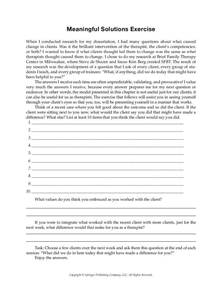 Worksheets Resolution Focused Narrative Therapy Linda Met calf, PhD, PCs, LMFTSISBN: 9780826132994Copyright Springer Publishing Company, LLC. All Rights Reserved. Meaningful Solutions Exercise When