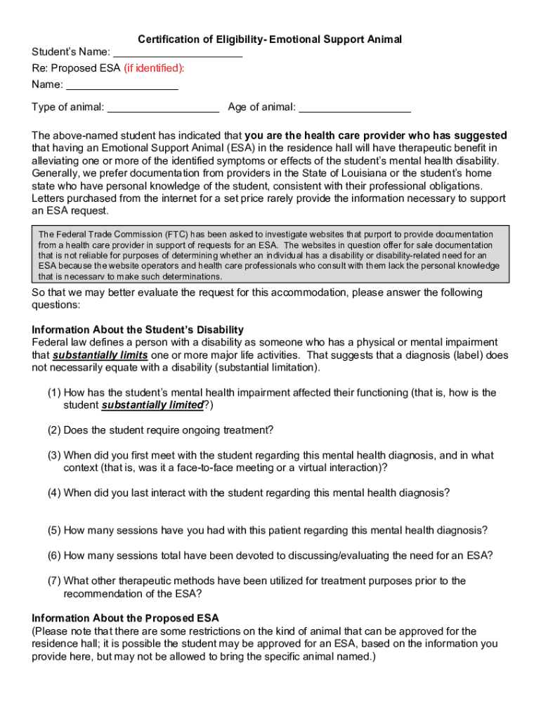 Certification of Eligibility Emotional Support Animal Students Name: ___ Re: Proposed ESA (if identified): Name: ___ Type of animal: ___ Age of animal: ___ The above named student has indicated that