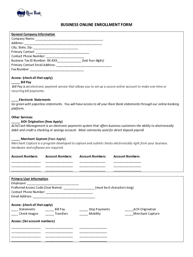 BUSINESS ONLINE ENROLLMENT FORM General Company Information Company Name: ___ Address: ___ City, State, Zip: ___ Primary Contact: ___ Contact Phone Number: ___ Business Tax ID Number: XXXIX___ (last