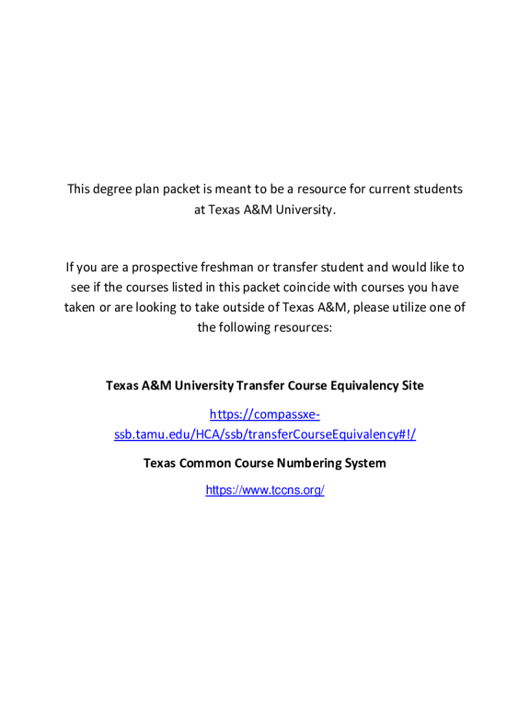 This degree plan packet is meant to be a resource for current students at Texas A&M University. If you are a prospective freshman or transfer student and would like to see if the courses listed in