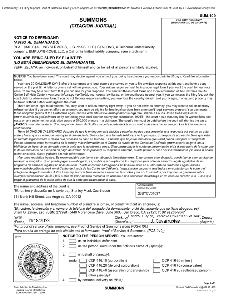Electronically FILED by Superior Court of California, County of Los Angeles on 01/18/2023 08:55 AM David W. Clayton, Executive Officer/Clerk of Court, by J. Covarrubias, Deputy Clerk 23STCV01037SUM100SUMMONSFOR