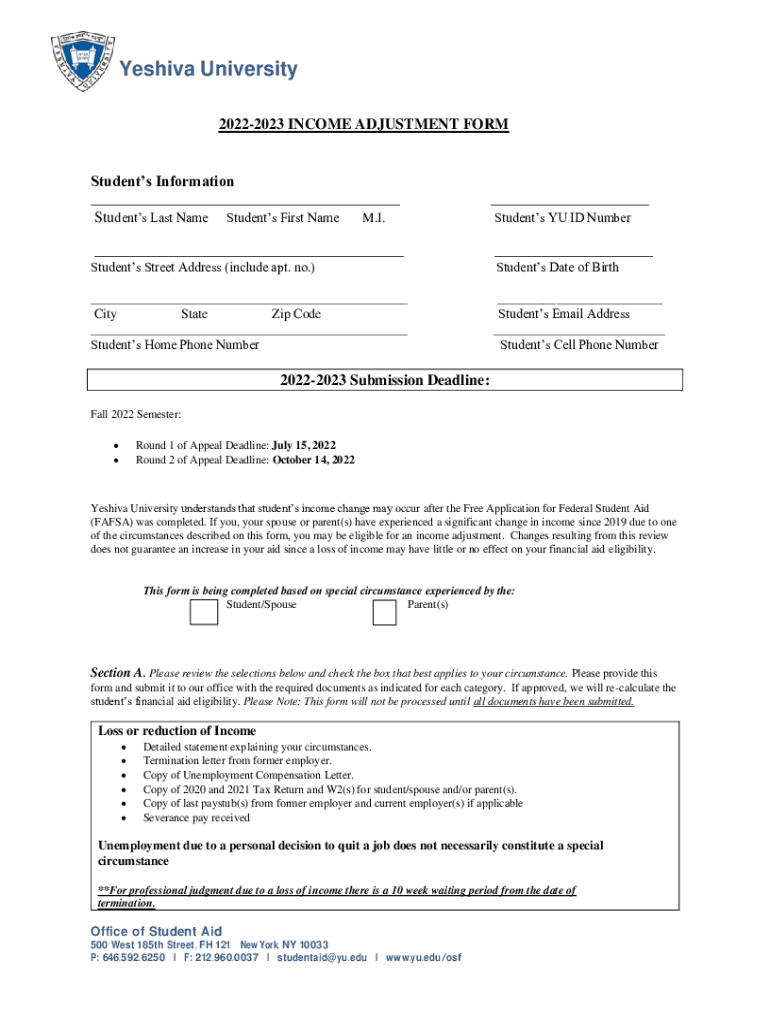 Yeshiva University 20222023 INCOME ADJUSTMENT FORMStudents Information ___ Students Last Name Students First Name M.I.___ Students YOU ID Number______Students Street Address (include apt. No.) Students
