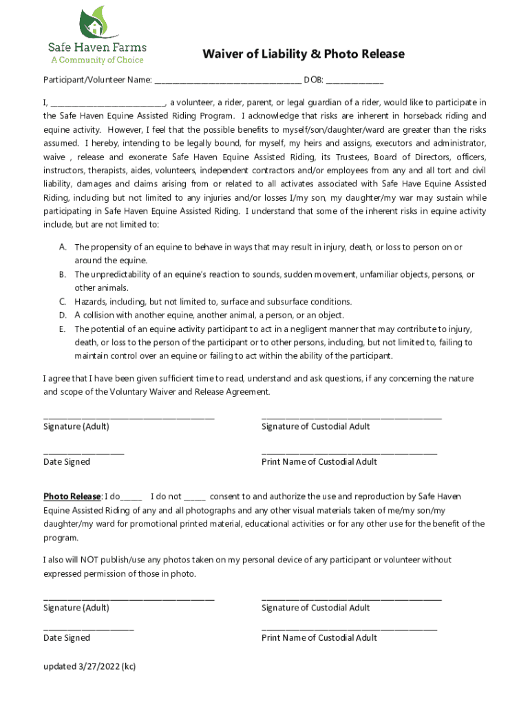 Waiver of Liability & Photo Release Participant/Volunteer Name: ___ DOB: ___ I, ___, a volunteer, a rider, parent, or legal guardian of a rider, would like to participate in the Safe Haven Equine