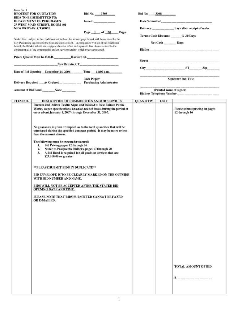 Form PUR. 1REQUEST FOR QUOTATION BIDS TO BE SUBMITTED TO: DEPARTMENT OF PURCHASES 27 WEST MAIN STREET, ROOM 401 NEW BRITAIN, CT 06051Bid No. ___3308___Bid No. ___3308___Issued:___Date Submitted___