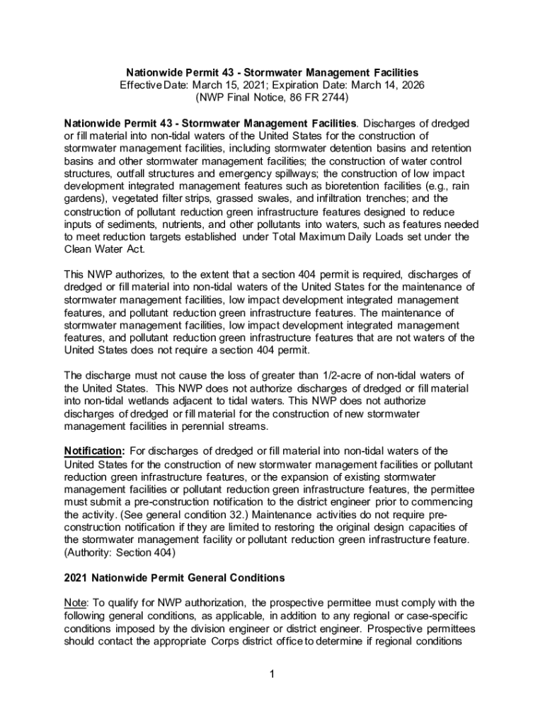 Nationwide Permit 43 Stormwater Management Facilities Effective Date: March 15, 2021; Expiration Date: March 14, 2026 (NP Final Notice, 86 FR 2744) Nationwide Permit 43 Stormwater Management Facilities.