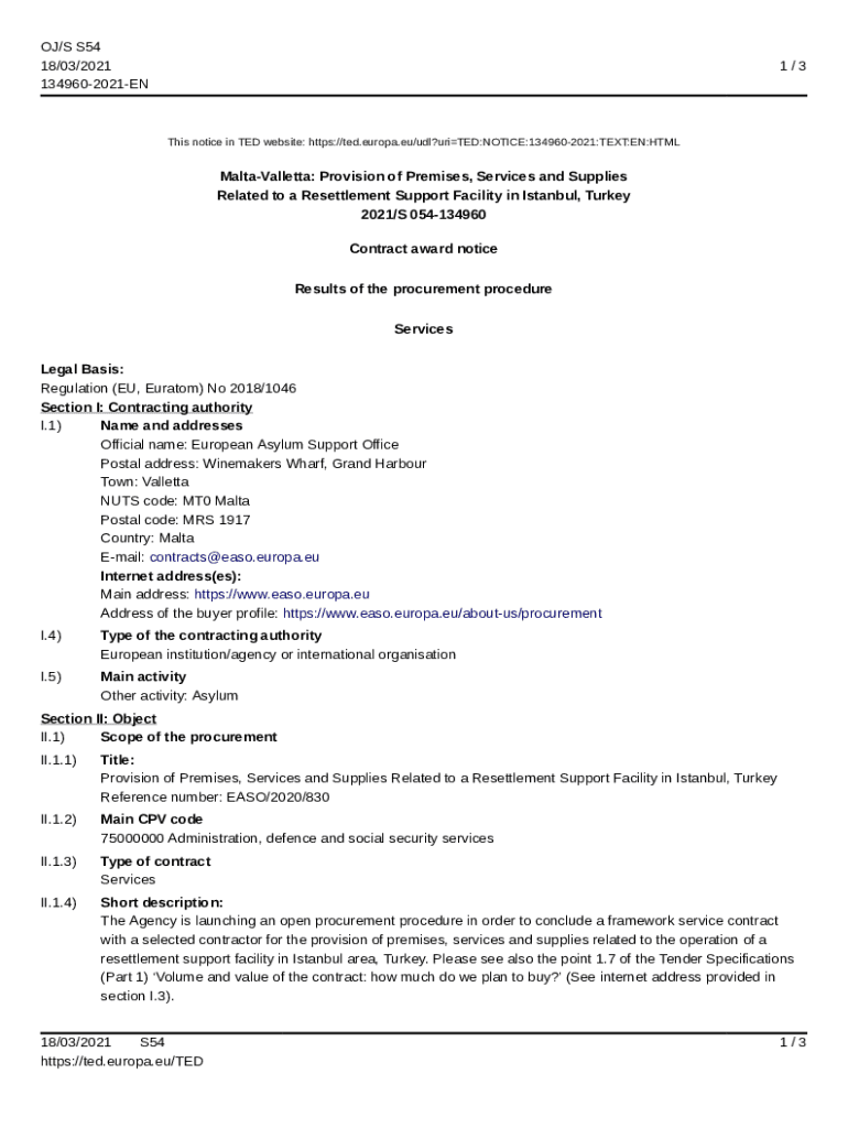 OJ/S S54 18/03/2021 1349602021EN1/3This notice in TED website: https://ted.europa.eu/udl?uriTED:NOTICE:1349602021:TEXT:EN:HTMLMaltaValletta: Provision of Premises, Services and Supplies Related to