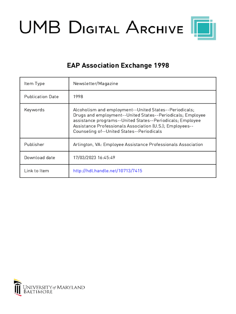 EAP Association Exchange 1998 Item TypeNewsletter/MagazinePublication Date1998KeywordsAlcoholism and employmentUnited StatesPeriodicals; Drugs and employmentUnited StatesPeriodicals; Employee assistance