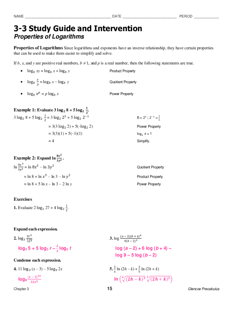NAME ___ DATE ___ PERIOD ___33 Study Guide and Intervention Properties of Logarithms Properties of Logarithms Since logarithms and exponents have an inverse relationship, they have certain properties