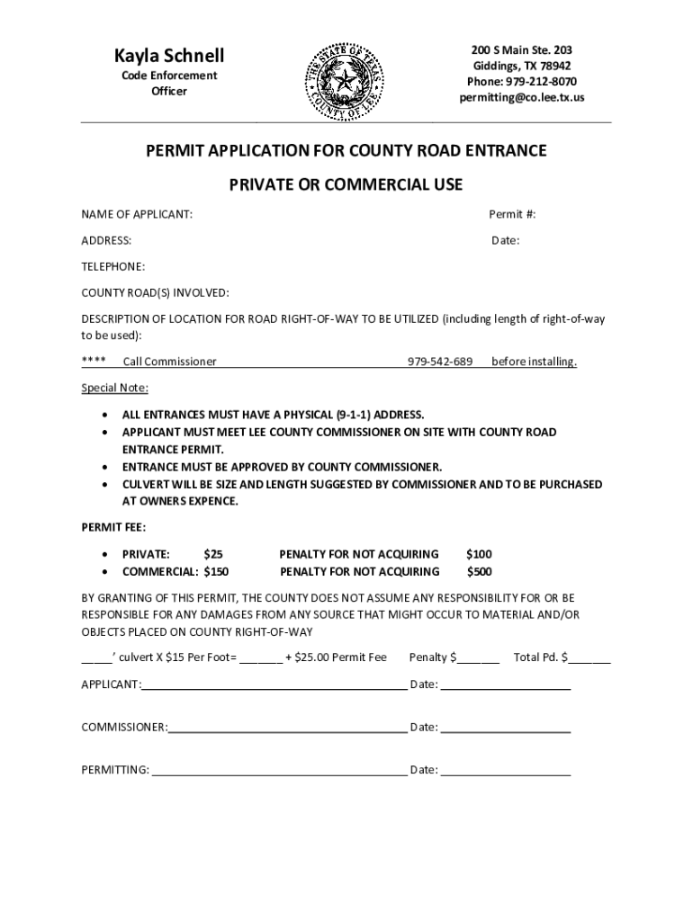 OfficerPERMIT APPLICATION FOR COUNTY ROAD ENTRANCE