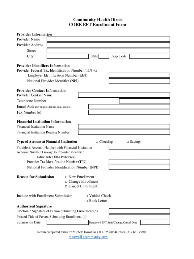 Community Health Direct CORE EFT Enrollment Form Provider Information Provider Name Provider Address Street CityStateZip CodeProvider Identifiers Information Provider Federal Tax Identification Number