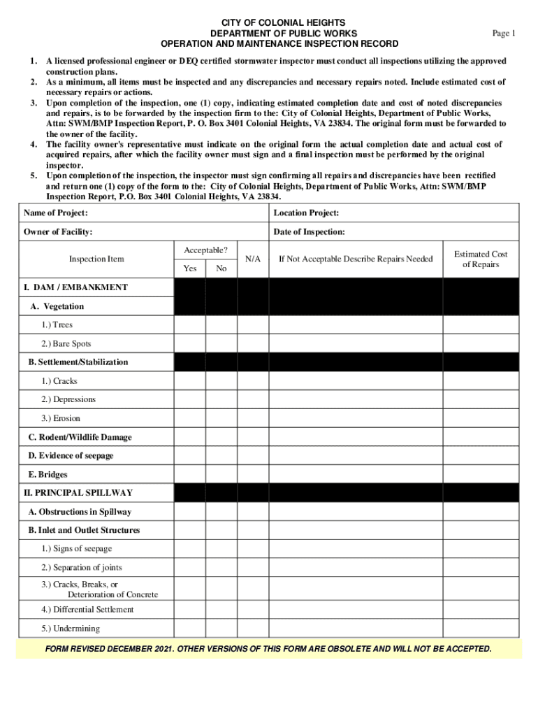 CITY OF COLONIAL HEIGHTS DEPARTMENT OF PUBLIC WORKS OPERATION AND MAINTENANCE INSPECTION RECORD 1. 2. 3.4. 5. Page 1A licensed professional engineer or DEQ certified stormwater inspector must conduct