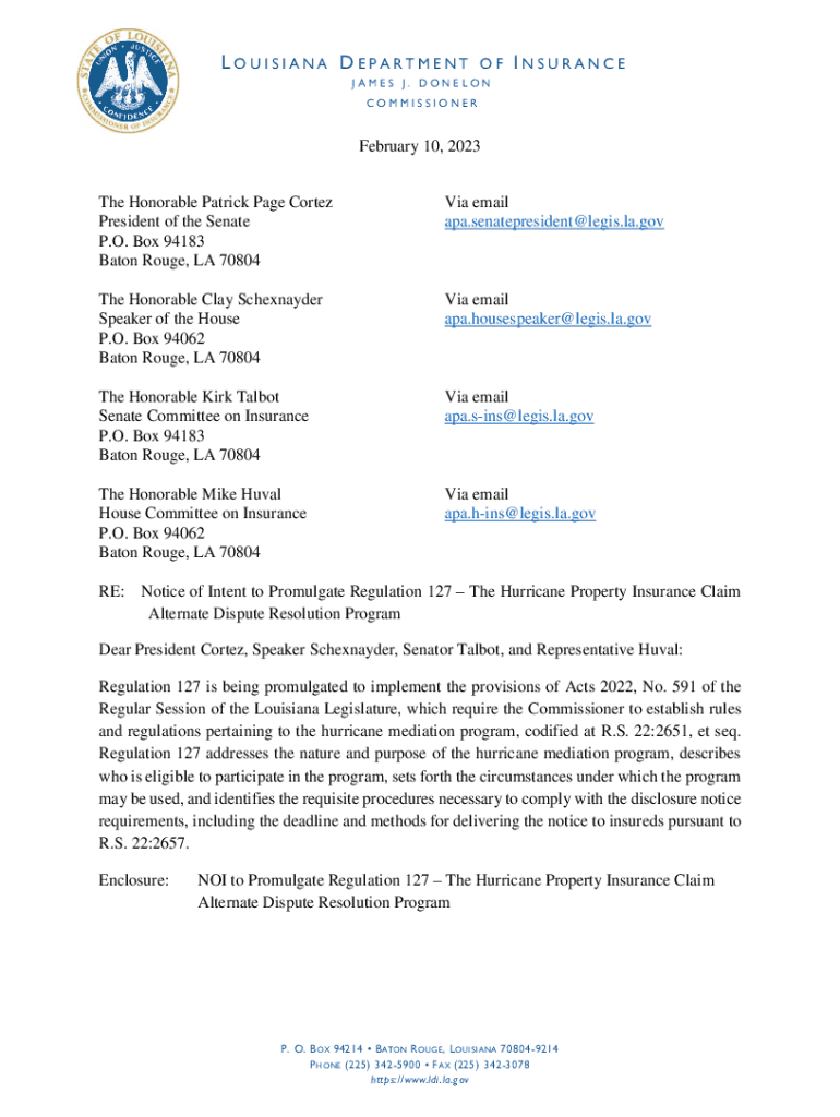 LOUISIANA DEPARTMENTOFINSURANCEJAMES J. DONELSON COMMISSIONER February 10, 2023, The Honorable Patrick Page Cortez President of the Senate P.O. Box 94183 Baton Rouge, LA 70804Via email apa.senatepresident@legis.la.govThe