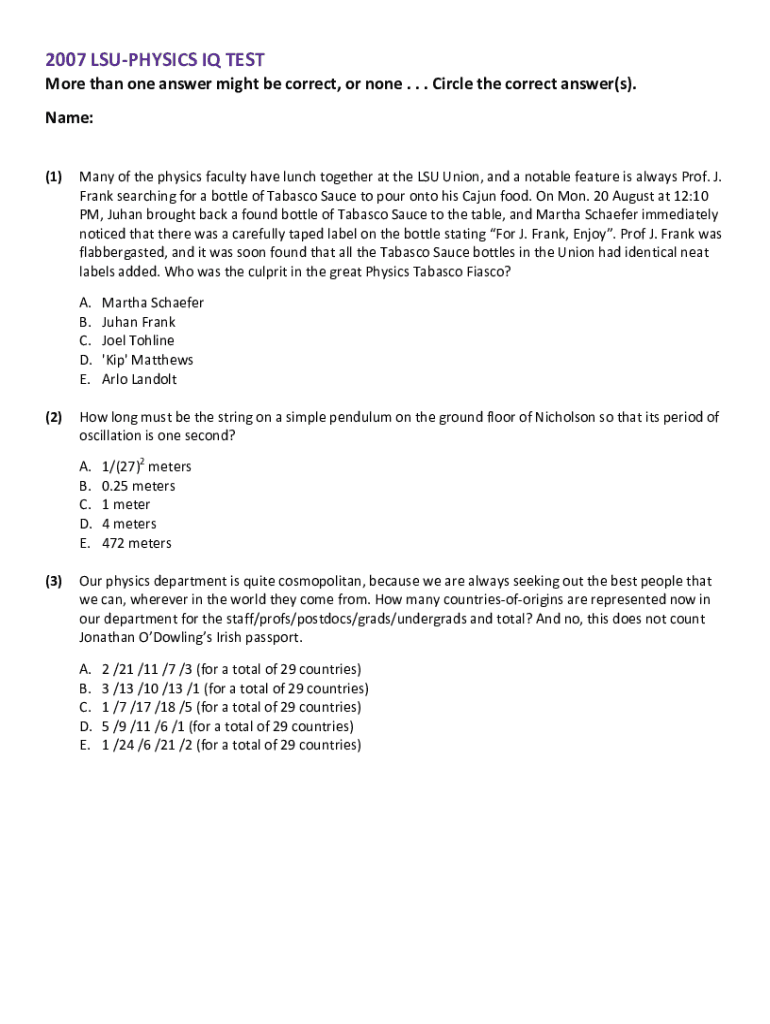 (1) ManyofthephysicsfacultyhavelunchtogetherattheLSUUnion, andanotablefeatureisalwaysProf. J.