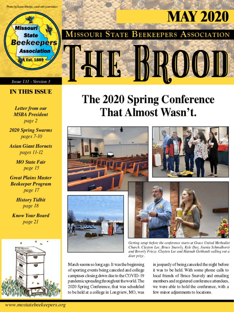 Photo by Susan Medan, used with permission 2020 M MISSOURI S TATE B BEEKEEPERS A SSOCIATIONIssue 131 Version 3IN THIS Issue BroodLetter from our SBA President page 2The 2020 Spring Conference That