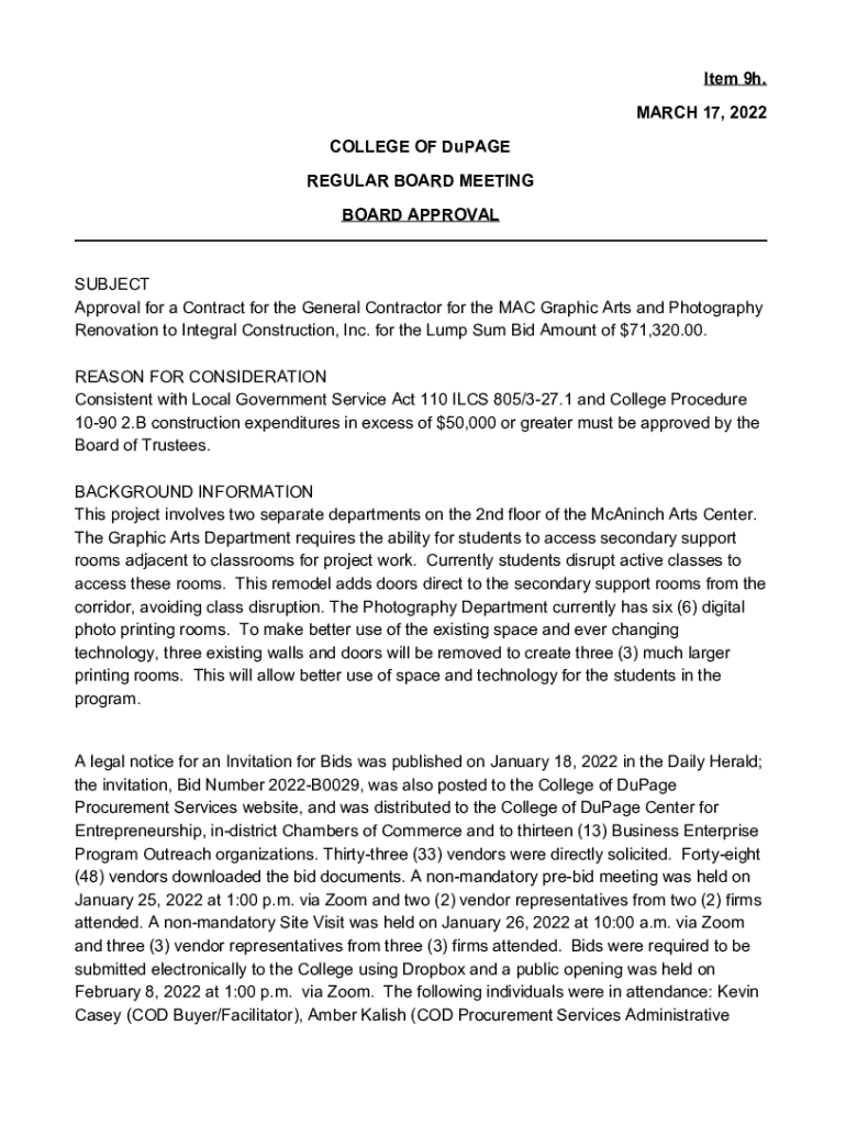 Item 9h. MARCH 17, 2022, COLLEGE OF Dupage REGULAR BOARD MEETING BOARD APPROVALSUBJECT Approval for a Contract for the General Contractor for the MAC Graphic Arts and Photography Renovation to Integral