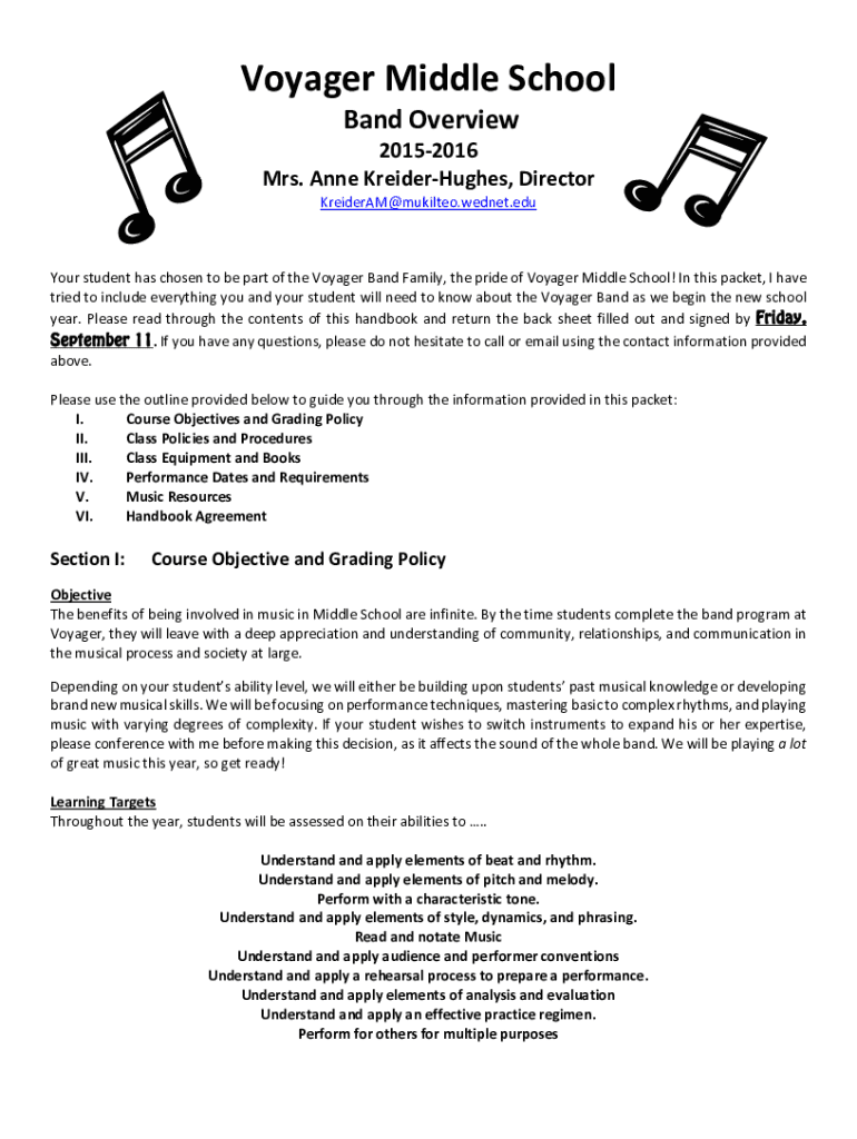 VoyagerMiddleSchool BandOverview 20152016 Mrs. AnneKreiderHughes, Director KreiderAM@mukilteo.wednet.edu YourstudenthaschosentobepartoftheVoyagerBandFamily, theprideofVoyagerMiddleSchool! Inthispacket,
