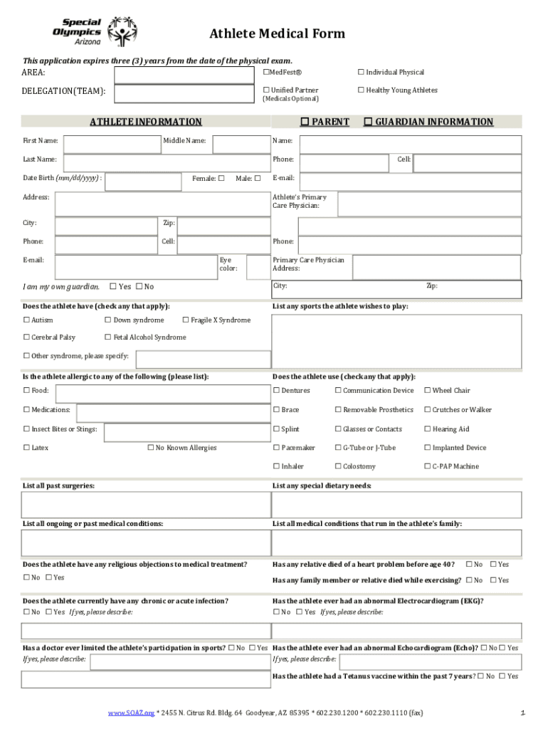 Athlete Medical Form This application expires three (3) years from the date of the physical exam.AREA:Modest Individual PhysicalDELEGATION(TEAM): Unified Partner Healthy Young Athletes(Medicals Optional)ATHLETE