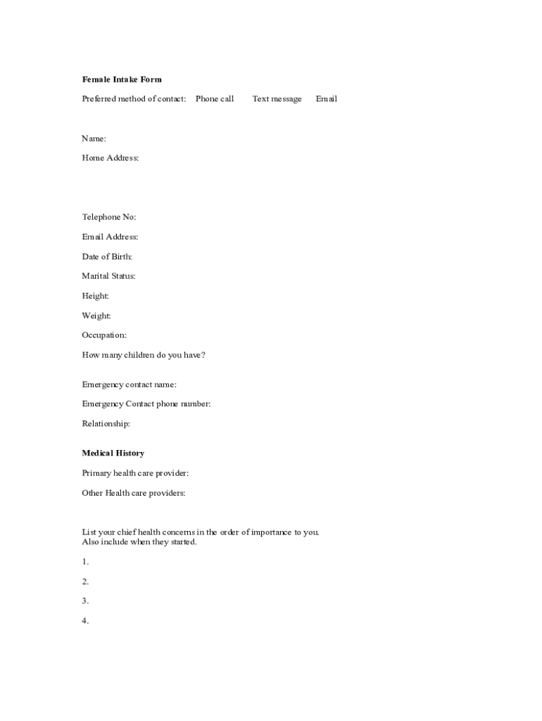 Get the free Female Intake Form Preferred method of contact: Phone call ...