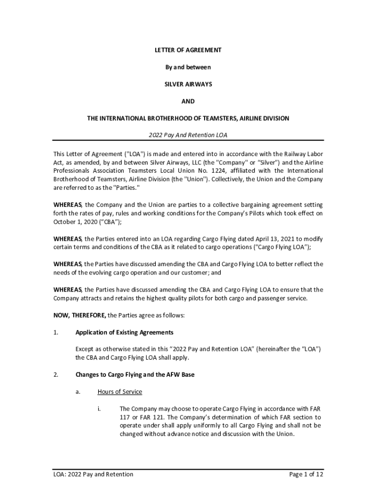 LETTER OF AGREEMENT By and between SILVER AIRWAYS AND THE INTERNATIONAL BROTHERHOOD OF TEAMSTERS, AIRLINE DIVISION 2022 Pay And Retention LOA This Letter of Agreement (\” LOA\”) is made and entered