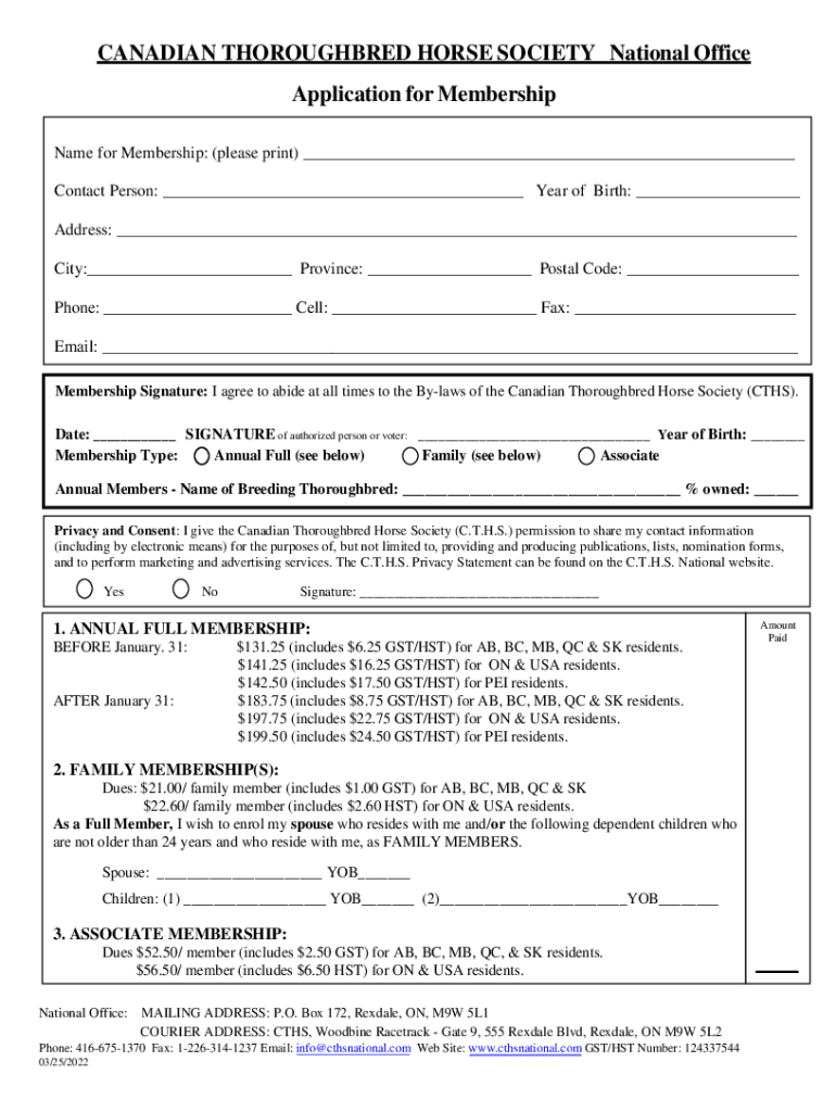 CANADIAN THOROUGHBRED HORSE SOCIETY National Office Application for Membership Name for Membership: (please print) ___ Contact Person: ___ Year of Birth: ___ Address: ___ City:___ Province: ___ Postal