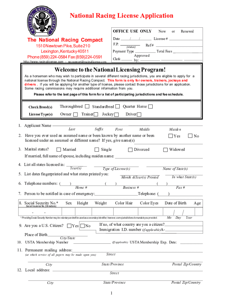 National Racing License Application OFFICE USE ONLY /Date F.P. The National Racing Compact 1510 Newton Pike, Suite 210 Lexington, Kentucky 40511 Phone (859) 2240584 Fax (859)2240591/NewRenewalLicense