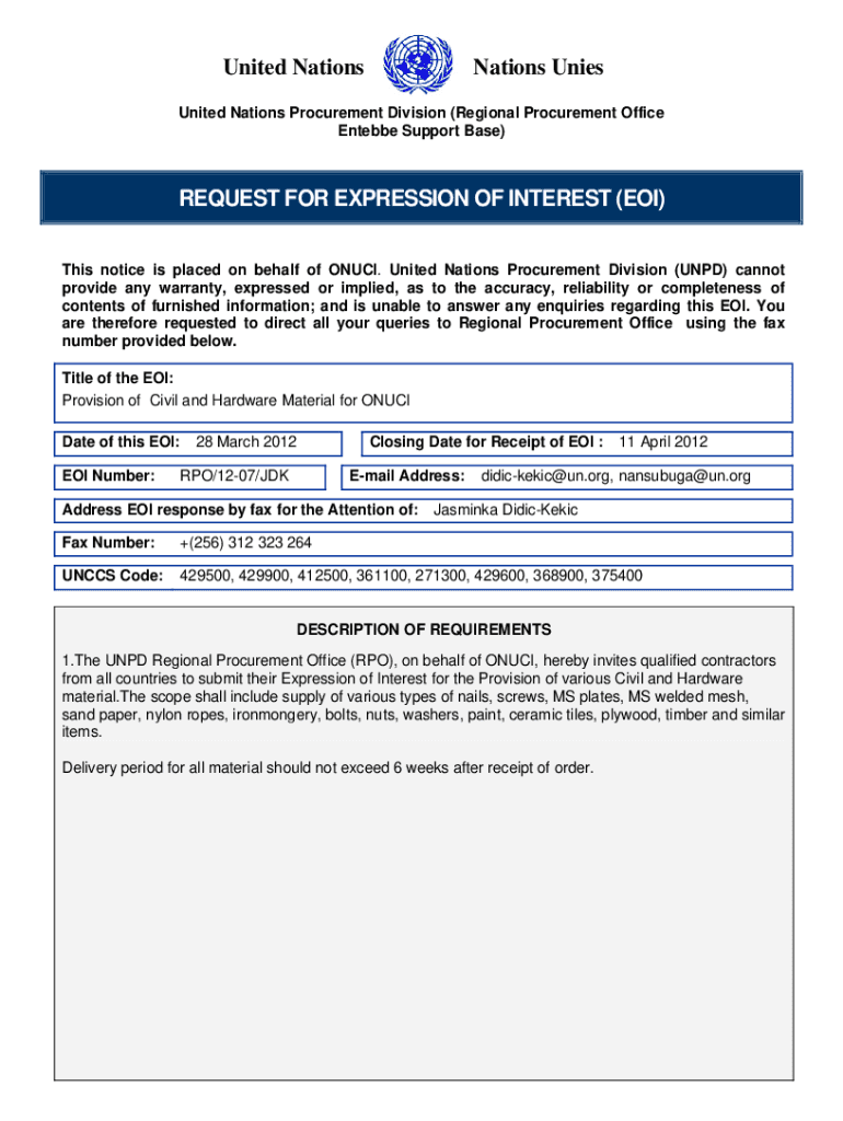 United NationsNations Unrequited Nations Procurement Division (Regional Procurement Office Entente Support Base)REQUEST FOR EXPRESSION OF INTEREST (EOI) This notice is placed on behalf of ONUCI. United