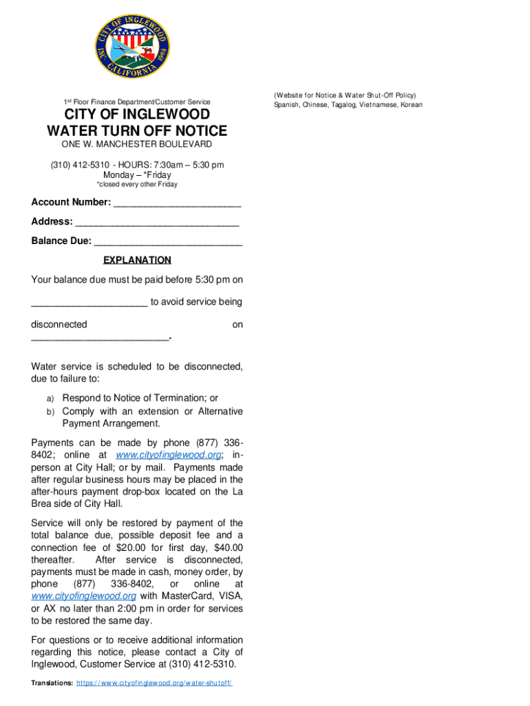 (Website for Notice & Water Shutoff Policy) Spanish, Chinese, Tagalog, Vietnamese, Korean1st Floor Finance Department/Customer Servility OF INGLEWOOD WATER TURN OFF NOTICE ONE W. MANCHESTER BOULEVARD