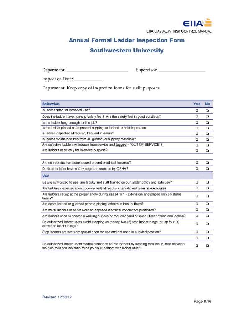 EIA CASUALTY RISK CONTROL MANUALAnnual Formal Ladder Inspection Form Southwestern UniversityDepartment: ___Supervisor: ___Inspection Date: ___ Department: Keep copy of inspection forms for audit purposes.