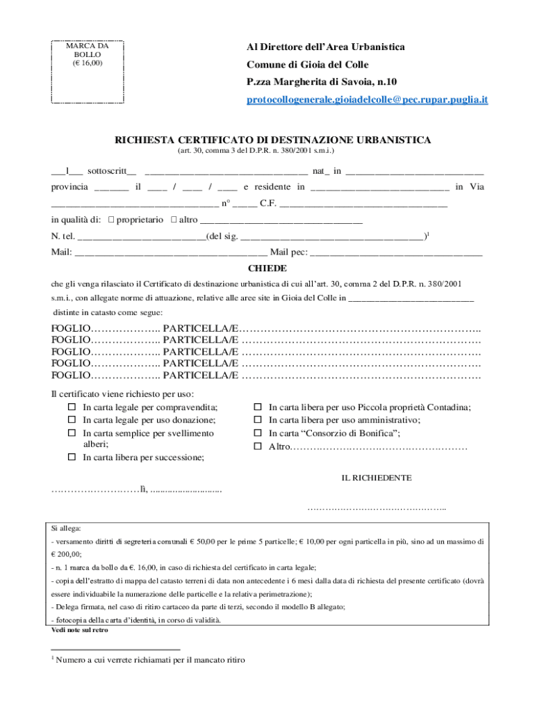 Al Director declared UrbanisticaMARCA DA BOLL (16,00)Commune di Iowa del Cole P.AZA Margherita DI Avoid, n.10 protocollogenerale.gioiadelcolle@pec.rupar.puglia.itRICHIESTA CERTIFICATE DI DESTINATION