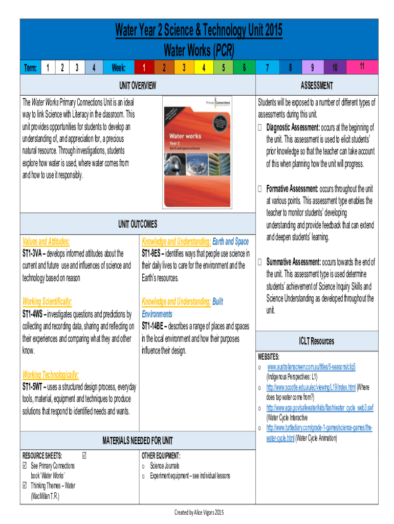 Water Year 2 Science & Technology Unit 2015 Water Works (PCR) Term:1234Week:123456UNIT OVERVIEW91011Students will be exposed to a number of different types of assessments during this unit. Diagnostic