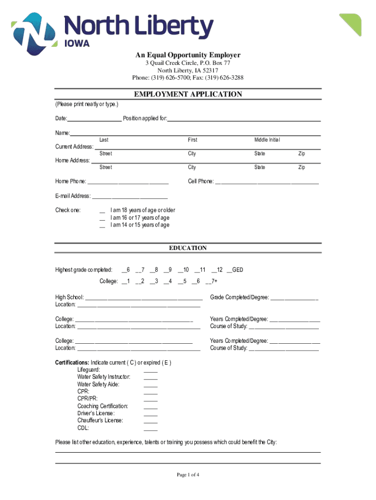 An Equal Opportunity Employer 3 Quail Creek Circle, P.O. Box 77 North Liberty, IA 52317 Phone: (319) 6265700; Fax: (319) 6263288EMPLOYMENT APPLICATION (Please print neatly or type.) Date:Position
