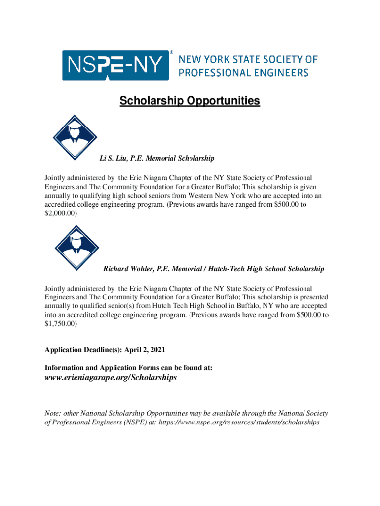 Scholarship Opportunities Li S. Liu, P.E. Memorial Scholarship Jointly administered by the Erie Niagara Chapter of the NY State Society of Professional Engineers and The Community Foundation for a
