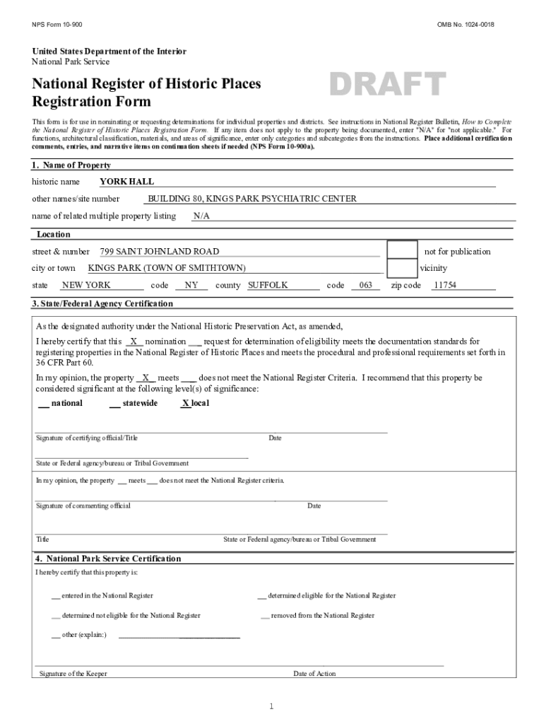 NPS Form 10900OMB No. 10240018United States Department of the Interior National Park ServiceDRAFTNational Register of Historic Places Registration Forms form is for use in nominating or requesting