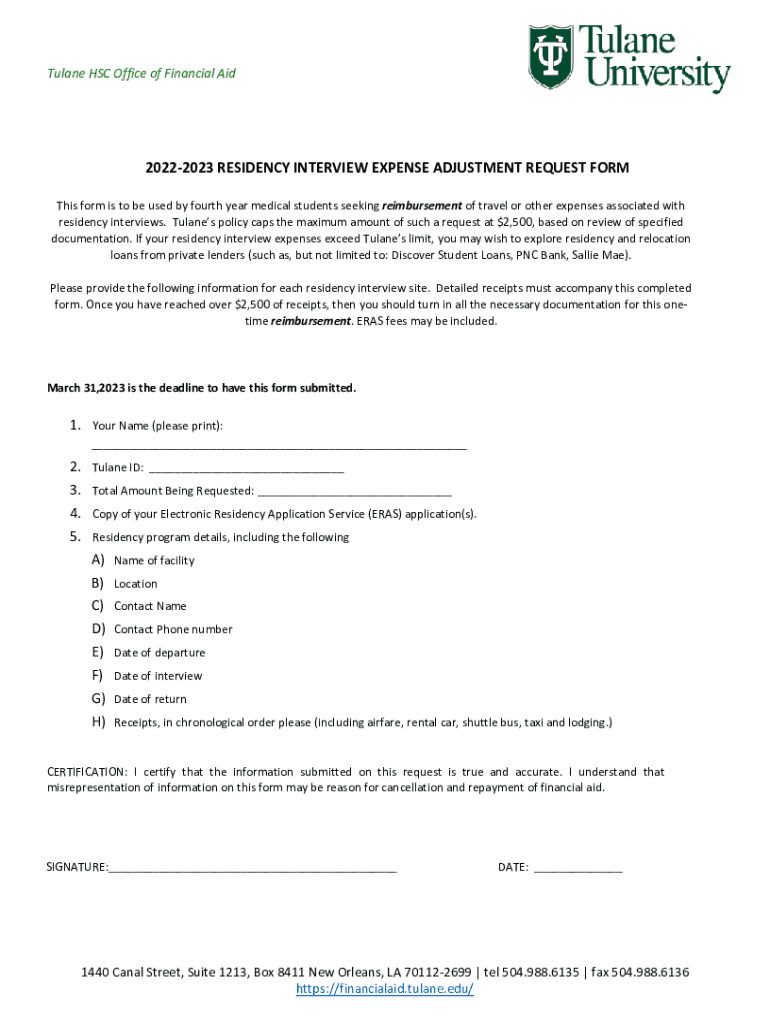 Tulane HSC Office of Financial Aid20222023 RESIDENCY INTERVIEW EXPENSE ADJUSTMENT REQUEST From This form is to be used by fourth year medical students seeking reimbursement of travel or other expenses
