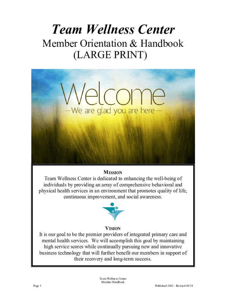 Team Wellness CenterMember Orientation & Handbook (LARGE PRINT)MISSION Team Wellness Center is dedicated to enhancing the wellbeing of individuals by providing an array of comprehensive behavioral