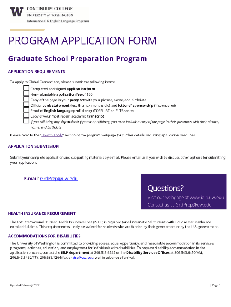 PROGRAM APPLICATION FORM Graduate School Preparation Program APPLICATION REQUIREMENTS To apply to Global Connections, please submit the following items: Completed and signed application form Nonrefundable