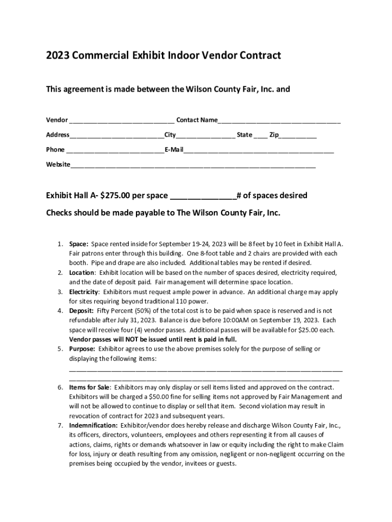 2023 Commercial Exhibit Indoor Vendor Contract This agreement is made between the Wilson County Fair, Inc. and Vendor ___ Contact Name___ Address___City___ State ___ Zip___ Phone ___Email___ Website___Exhibit
