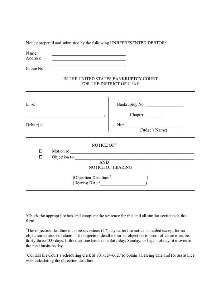 Notice prepared and submitted by the following UNREPRESENTED DEBTOR: Name: Address: Phone No.:___ ___ ___ ___ IN THE UNITED STATES BANKRUPTCY COURT FOR THE DISTRICT OF Utahan re:Bankruptcy No. ______,